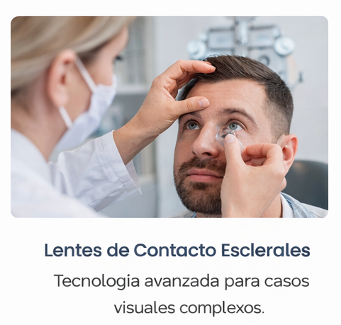 Los lentes esclerales son lentes de contacto especiales que descansan sobre la parte blanca del ojo, creando una cámara de líquido que mejora la visión y brinda máxima comodidad. Son ideales para pacientes con queratocono, ojo seco severo o irregularidades corneales.